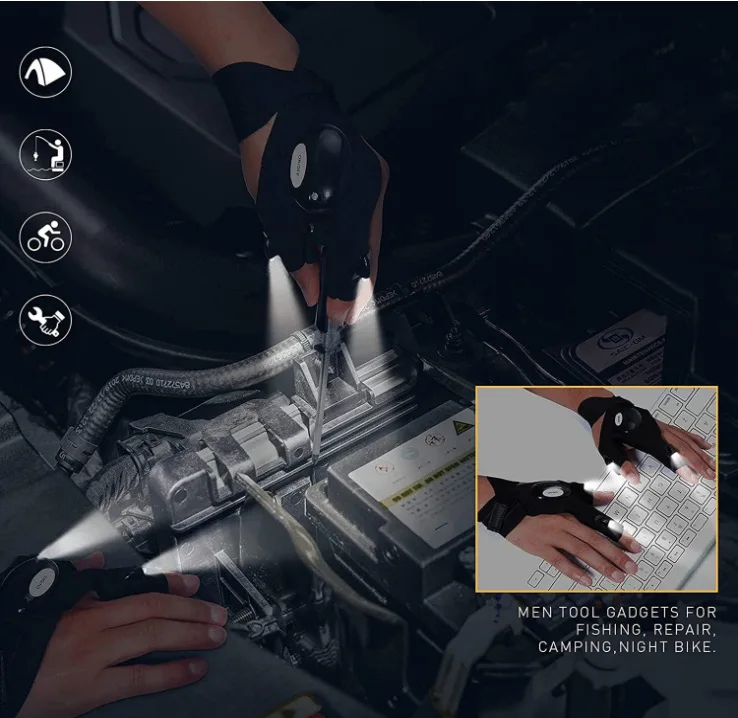 Les gants de lampe de poche sont pratiques dans votre vie quotidienne, conviennent aux pêcheurs, amateurs de gadgets, ingénieurs de réseau, plombier, conviennent également aux activités de plein air, telles que le camping en montagne, le cyclisme, la randonnée, courir et ainsi de suite.